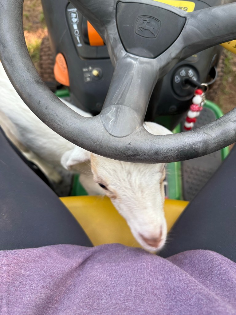 Farm chores just got a little fancier — finally got myself a John Deere tractor/mower so I don’t have to trek up and down the hill hauling water buckets and feed. 🚜 But of course, Charles (our bottle baby goat who doesn’t know he’s a goat) decided it’s his personal Uber service. So now every trip ends with him hitching a ride back up the hill like the king he thinks he is. 👑🐐